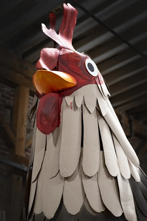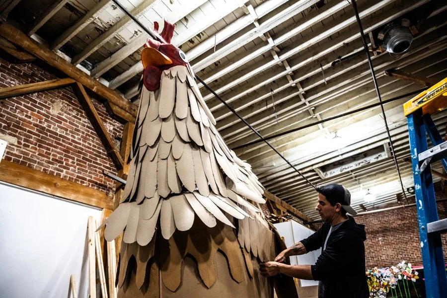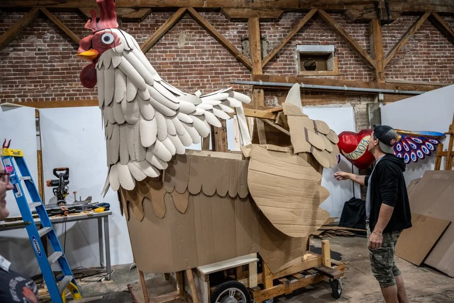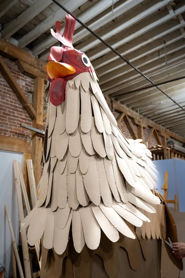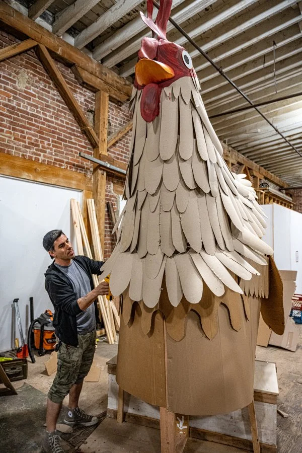 How do you build a giant chicken? With JOSH!! Chica Gallina was created from recycled wood, cardboard, and car batteries. Masterminded by Josh Cardenas, she was brought to life with the help of dozens of volunteers during Arts Alive. She made her debut at the 2024 Butter and Eggs Parade in Petaluma, escorted by our friends and partnering artists from Alchemia, and Kim Skipper Corbin’s magical Unicorn Blessing Brigade!